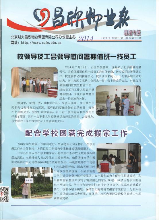 昌欣物业报由北京财大昌欣物业管理有限公司主办,旨在为学校师生提供一个了解昌欣物业的窗口,以季报的形式提供有关昌欣工作的专题动态,新闻资讯,拉近全校师生与昌欣物业公司的距离。